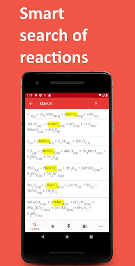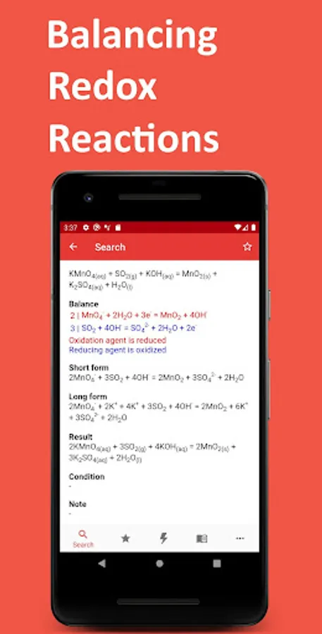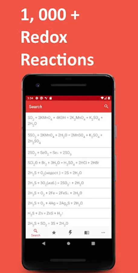 The uniqueness of the application is that its database contains more than 1000 examples of equations of redox reactions involving inorganic and organic substances. This database is equipped with a convenient search and the ability to save reactions to "Favorites". In addition to the complete chemical reaction equation, electronic and electron-ion balance schemes are available, as well as brief descriptions with explanations to them.