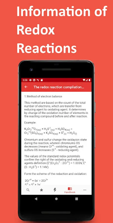 The "HandBook" section of the App includes the basic concepts of redox chemical reactions, classification and methods for compiling redox chemical reactions. The main schemes of redox reactions with such chemicals as permanganates, bichromates, sulfuric and nitric acids are also described. The reactivity series are also presented.