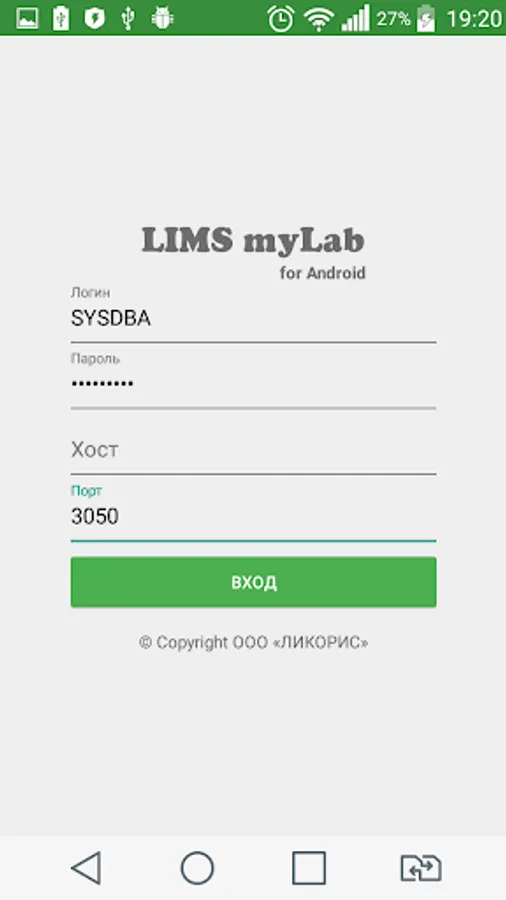 You must use your LIMS myLab account to enter the program. In the "Host" field, specify the IP address of the server, "Port" by default is 3050.