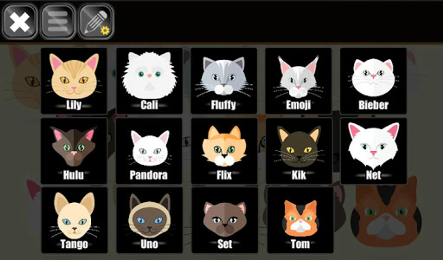 Meet and play all cats like Lily, Cali, Fluffy, Emoji, Bieber, Hulu, Pandora, Flix, Kik, Net , Tango, Uno, Set, Brid in Tom.