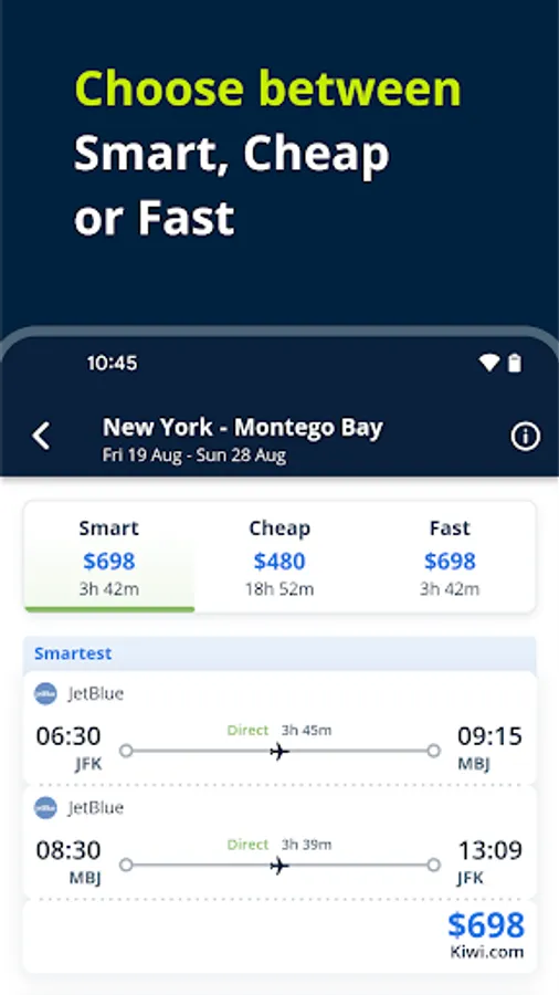 • Choose your plane ticket according to what is most important to you : cheapest price, shortest flight or smartest price (best time/price ratio).