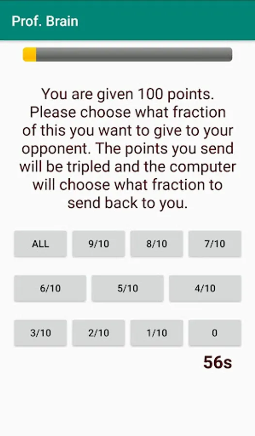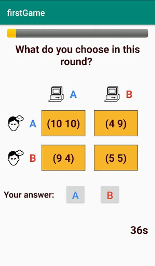 You will need to download an app and play a game that requires you to choose an option that gives you the best chance of earning the most points, taking into account that your opponent (the computer player 2) will be doing the same thing. You need to make 16 decisions in total (there are 16 rounds of the game). You will then be asked to answer a short questionnaire (the mini-IPIP questionnaire developed by Donnellan et al. (2006)[2]) and finally play another game which has 16 rounds. In total, you should be able to complete all tasks in approximately 20-30 minutes.