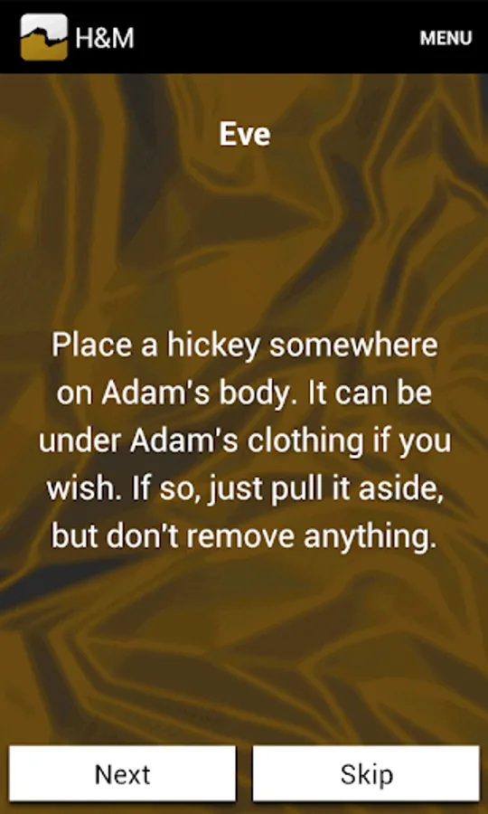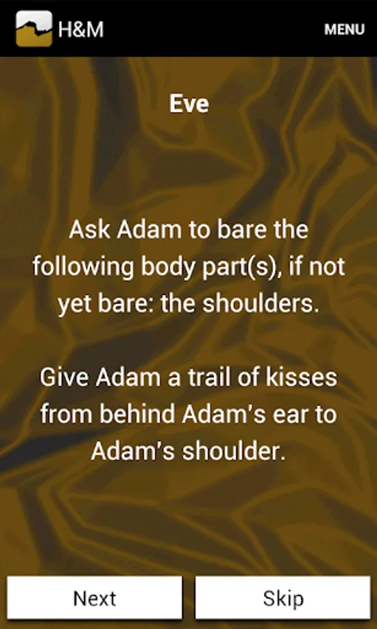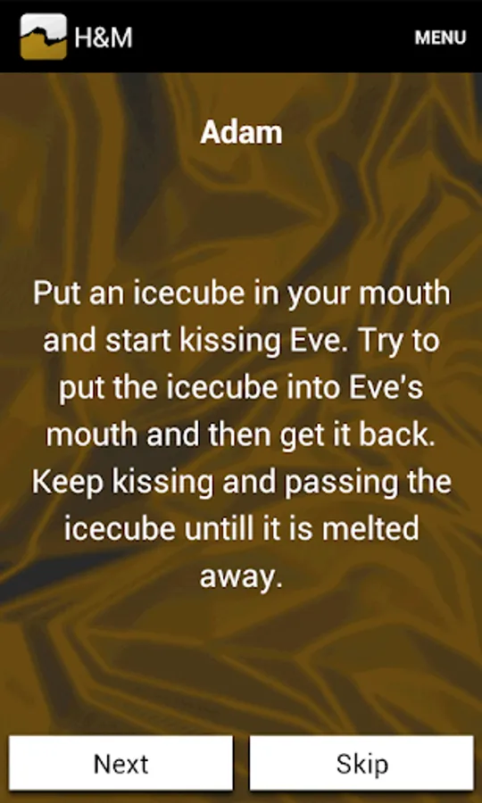 This game can help you to revive your kissing life as a married couple. For one hour you will be taking turns doing some actions that involve kissing each other. Starting from simple romantic kissing, the atmosphere will gradually become more and more intense. Before you know, you are making out, sliding into a long sensual foreplay session. You will get passionate, things will get erotic. Clothes will be shed and your lips and tongues will be all over each other's body. Even down there? Well, that's up to you!