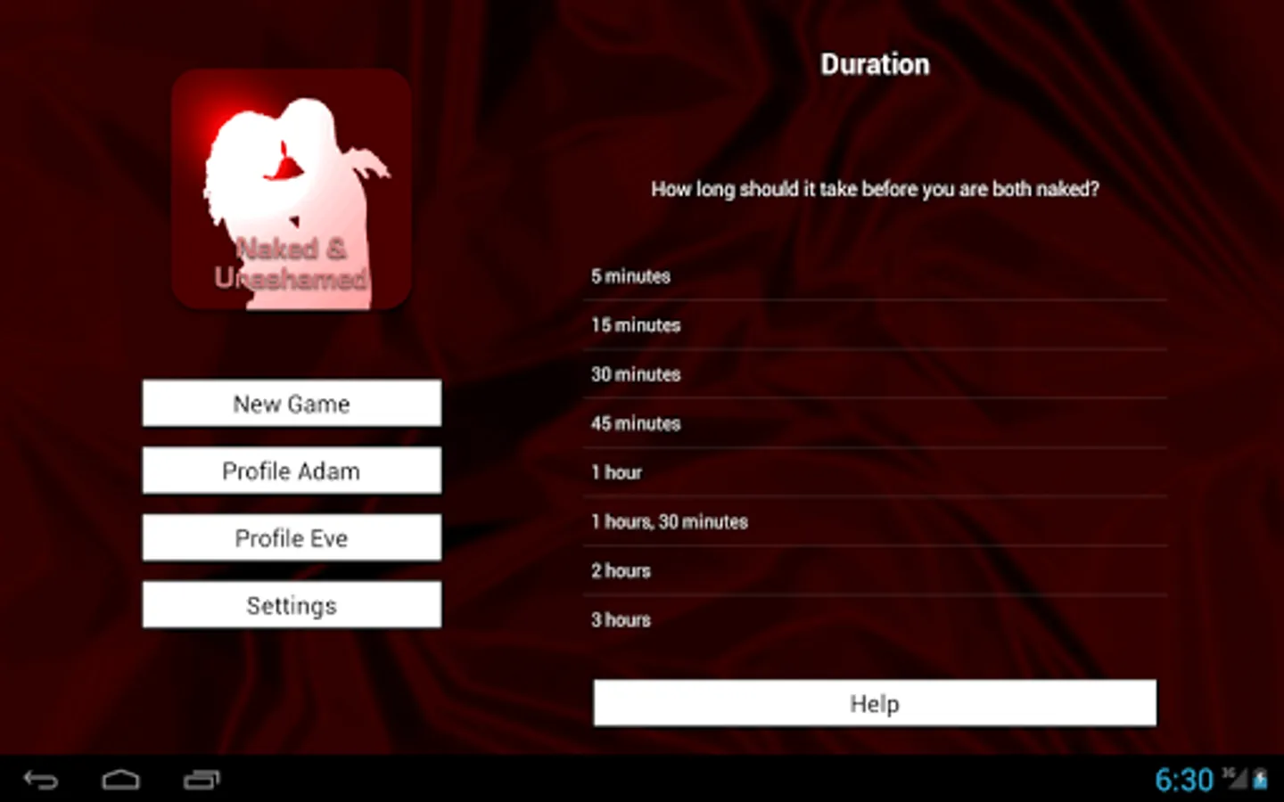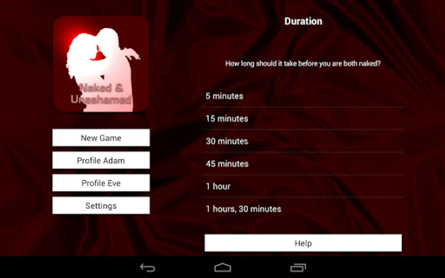 'Naked & Unashamed' will help you to experience this simple way of adding variation to your love making. You just enter which clothing items you both are wearing and how long it should take to get naked, ranging from 5 minutes to 5 hours. And then from time to time you get simple instructions about what item or items to take off and how to do it. One moment you take off something yourself and the next moment you remove something from your spouse. One night you undress slowly, 1 item at a time, and another night you undress quickly, removing everything at once. One day you will both be naked about the same time, and the next day one of you will be naked already while the other is still almost fully clothed.