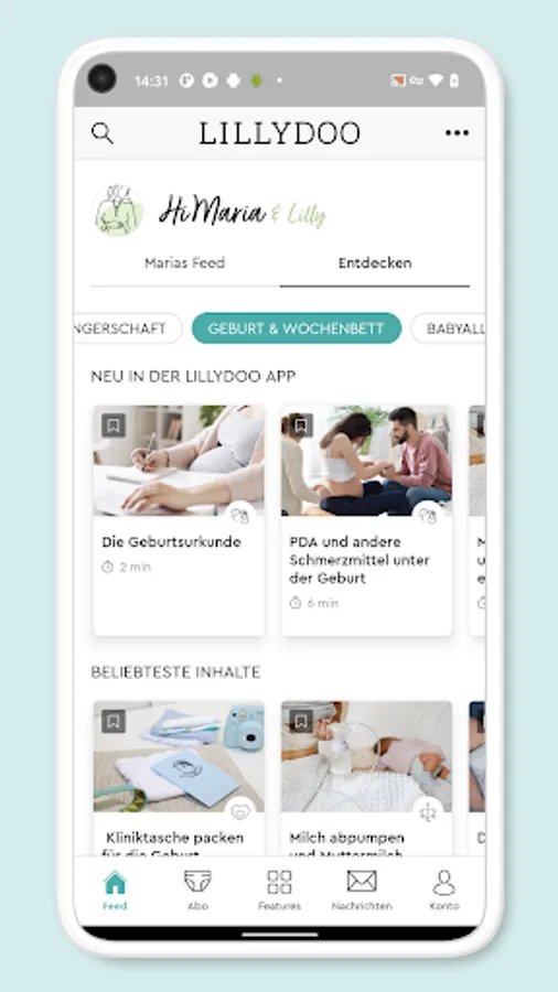 Mit unserem individuell auf Dich abgestimmten LILLYDOO Feed möchten wir Dich in Deinem Alltag als Schwangere, Mama oder (werdender) Papa begleiten und unterstützen. Wir zeigen Dir regelmäßig neue Inhalte, die Du ganz individuell auf Dich anpassen kannst. Personalisiere mit wenigen Fragen Deinen Feed und entdecke jede Woche auf Dich abgestimmte Inhalte, wie Schwangerschaft-Updates, Artikel und Videos zu Schwangerschafts-Themen, Geburt und Wochenbett, Babypflege, Babyentwicklung, Mal- und Bastelvorlagen zum Download und vieles mehr. Du möchtest über ein bestimmtes Thema mehr erfahren? Dann stöbere einfach in unseren Magazin-Kategorien oder nutze die Stichwort-Suche, um alle Inhalte zum Thema auf einen Blick zu sehen.