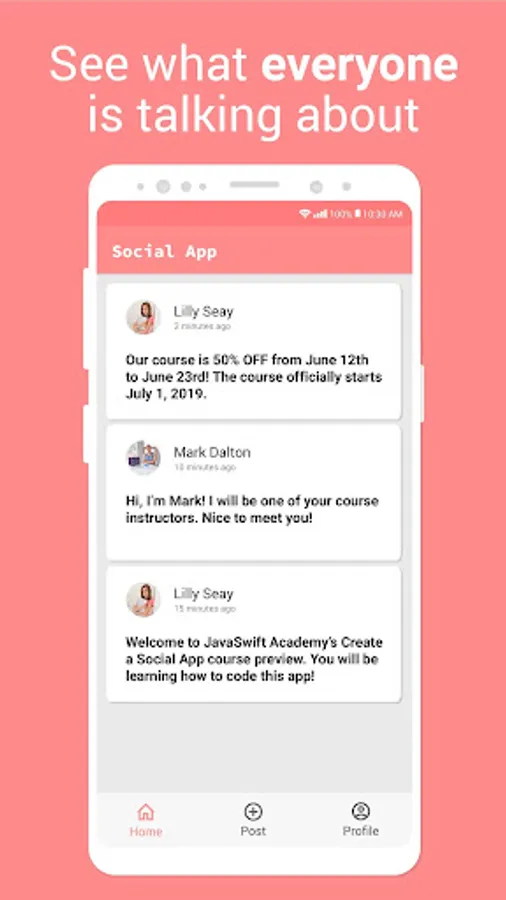This is a preview of the app you will make in our Create Your Own Social App course.
