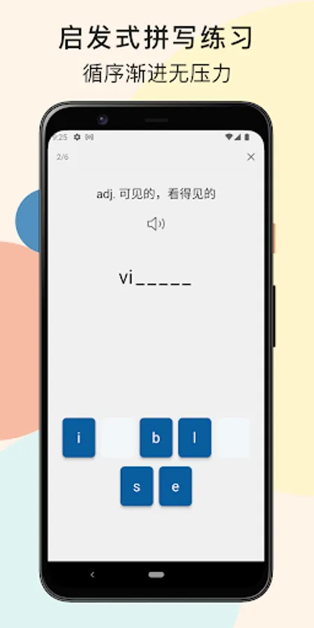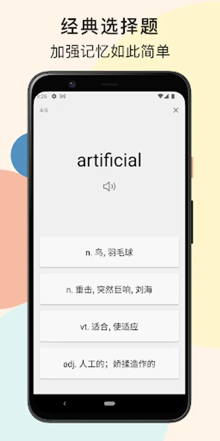 Word cards, pictures to aid memory. A variety of test question types, "multiple choice questions", "Q&A questions", "spelling questions", you can choose the test method according to your familiarity, 360-degree memory nerve stimulation, and get twice the result with half the effort.