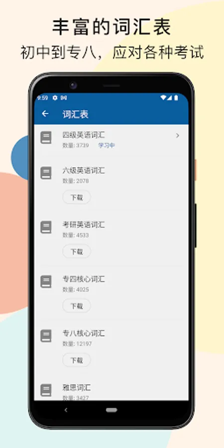 CET-4, CET-6, postgraduate entrance exams, 4th grade, 8th grade, TOEFL, IELTS, GRE, SAT, GMAT, high school entrance examination, college entrance examination, business English and other vocabulary lists, you can freely choose to learn.