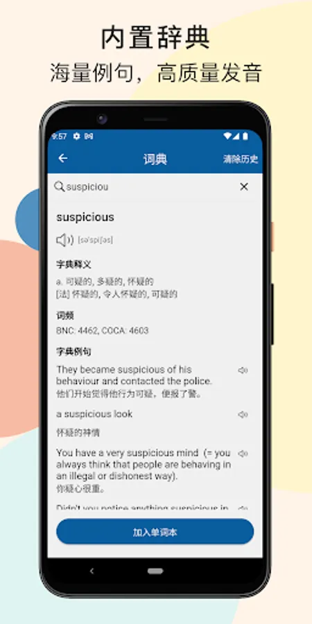 Not only words can be added, but also spoken English and English articles can be added. Click on the words in the example sentences and articles, you can look up the dictionary in real time, and easily add the new vocabulary.