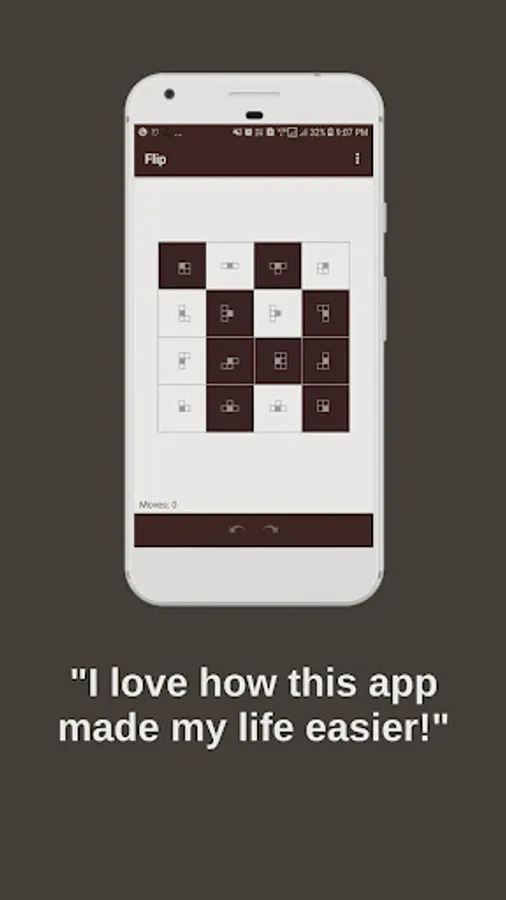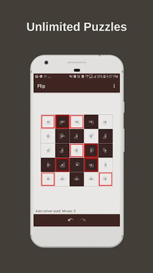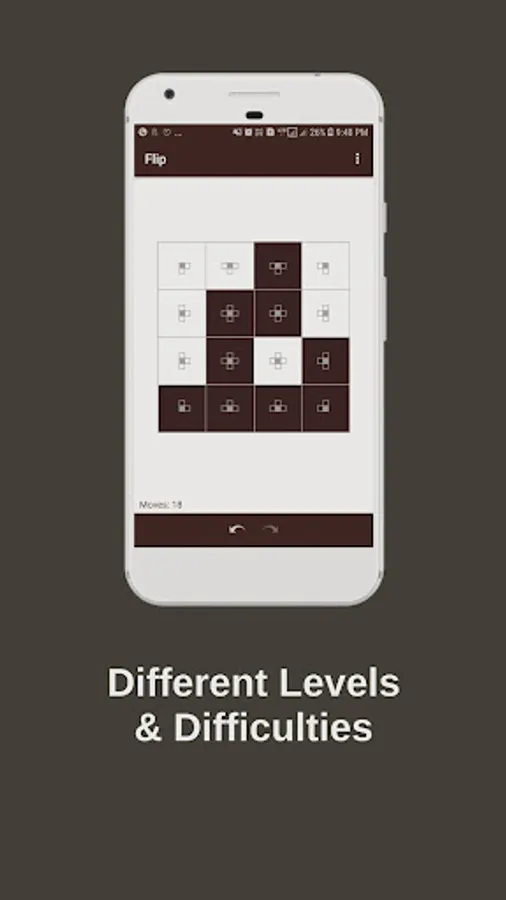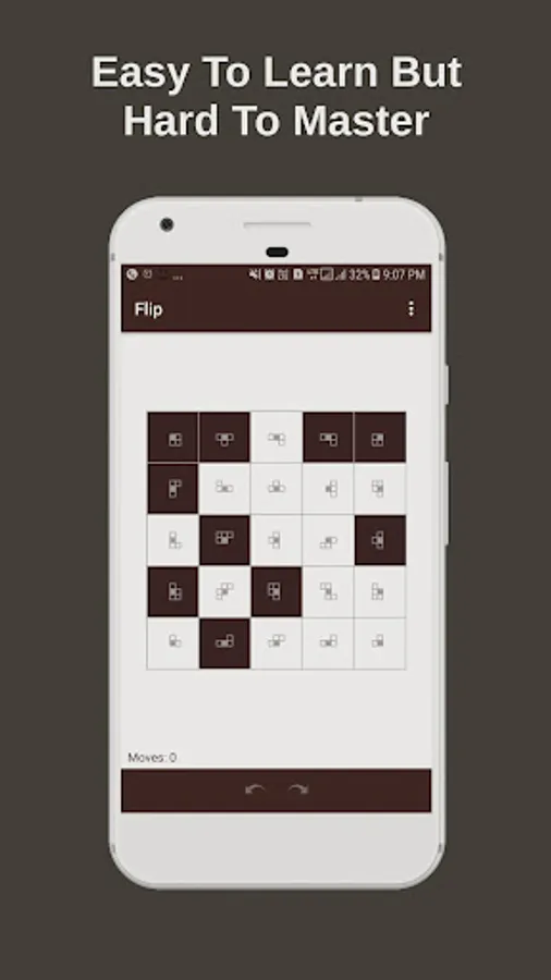 Your aim is to light all the squares up at the same time. You can choose any square and flip its state from light to dark or dark to light, but when you do so, other squares around it change state as well.