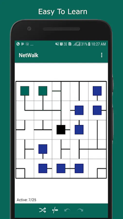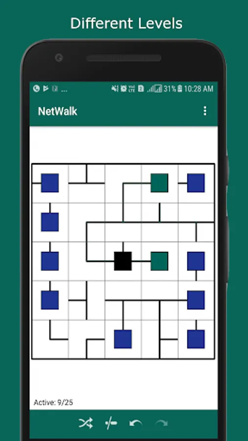 Your goal is to rotate and connect each blue node to the central server (black node). The successful solution will be an entirely connected network in which all node are connected to the one in the middle with highlighted green color.