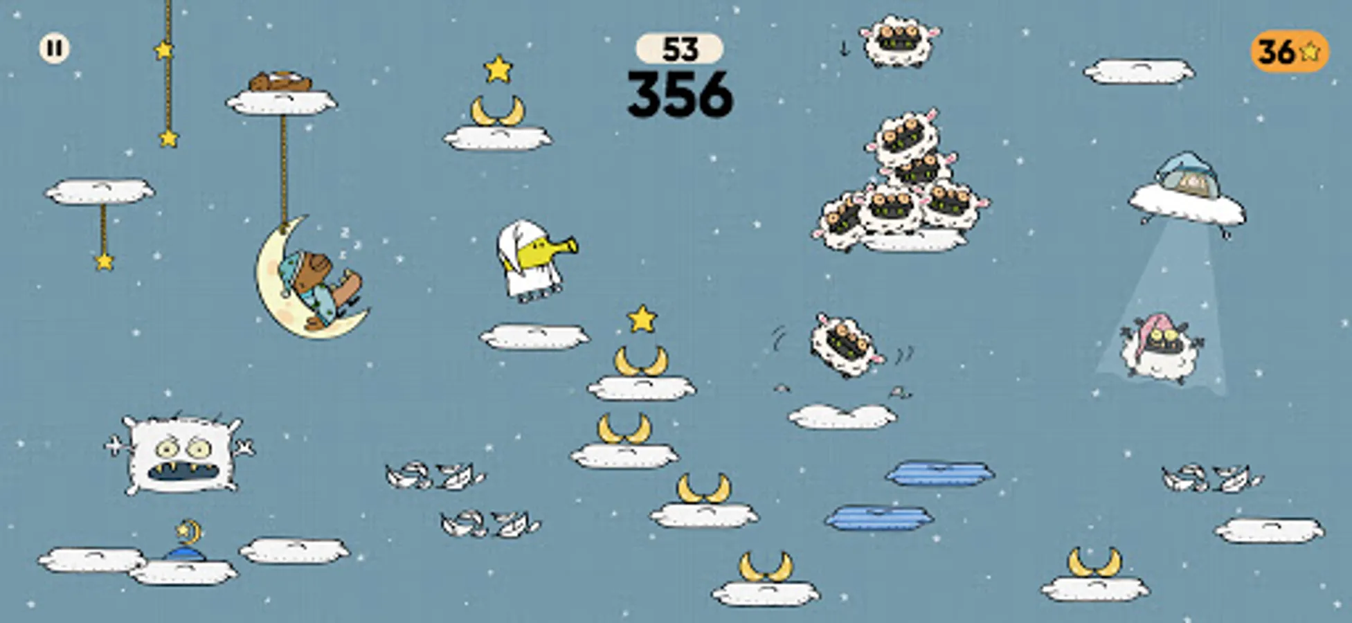 - Sleepy world with ba-ba sheep monsters, pillow monsters, fireflies, pillow platforms…