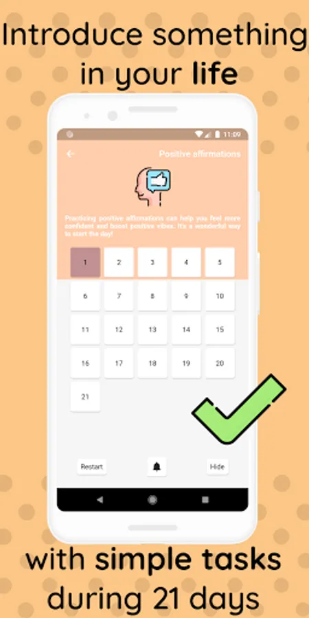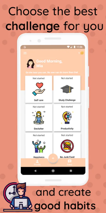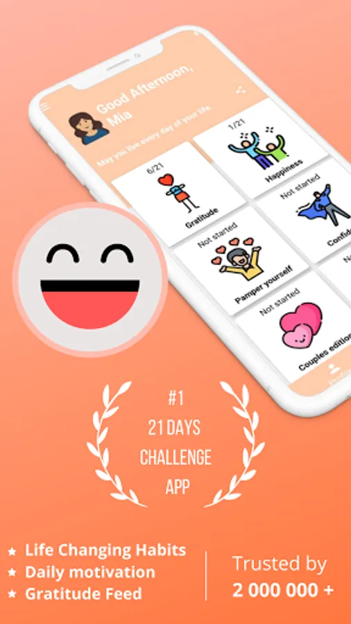 Starting a healthy lifestyle, taking a break away from the internet, practicing gratitude, learning a new language, trying to be more productive, finding happiness, self-help, how to study effectively, ways to spread kindness and positivity, tips for fixing your sleeping schedule, self-care practices, decluttering, being more confident, writing journal prompts and daily positive affirmations are some of the challenges that you can find in the app.