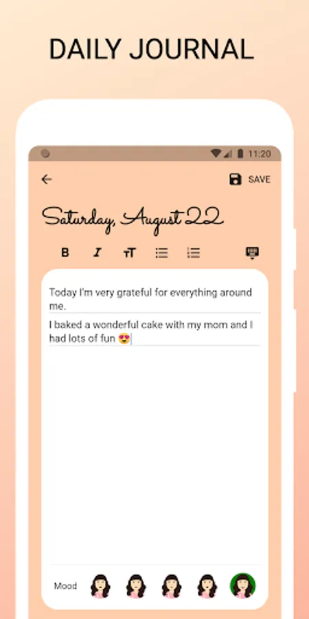 Create a healthier and happier mind with journaling. With this app, you can write a daily journal and choose your daily mood. Then you can track your mood in the calendar and see all your previous records.