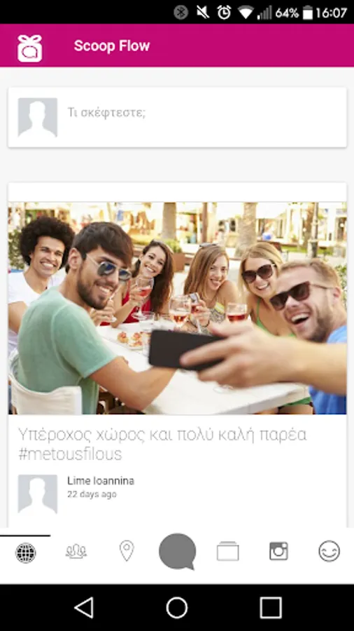 You can download the application and after registering to connect your Facebook account. Automatically you can see the "Flow" your friends' social actions to implement but also to locate Scoop businesses through the map.