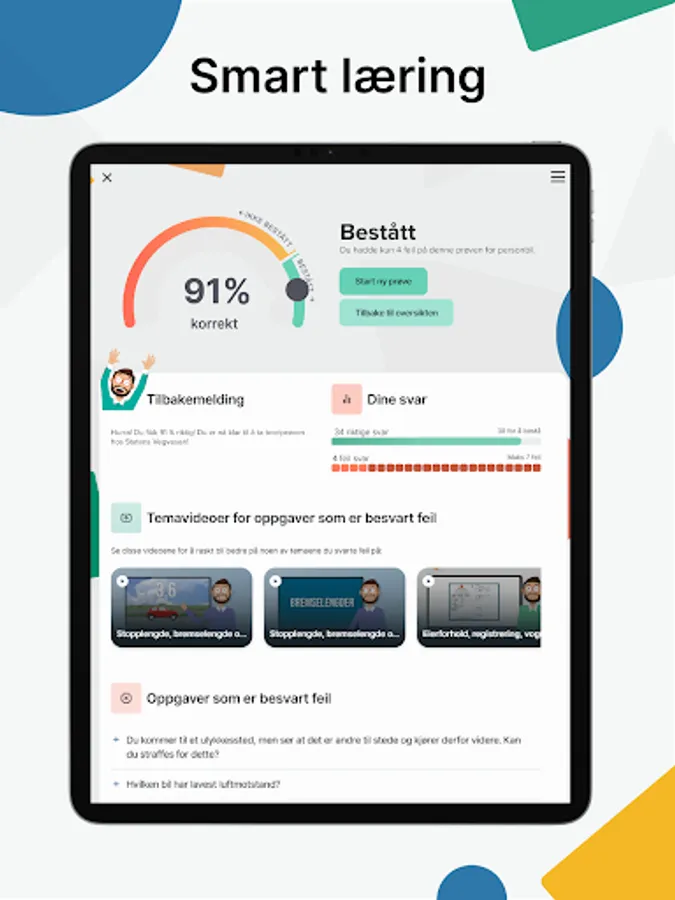 In our service you will find theory tests for car, moped, motorcycle and other vehicles. Test your your skill level anywhere before taking the official theory test at Statens Vegvesen. All tests are made by the Norwegian Driving School Association (ATL), and corresponds to the theory test taken at the traffic service station.
