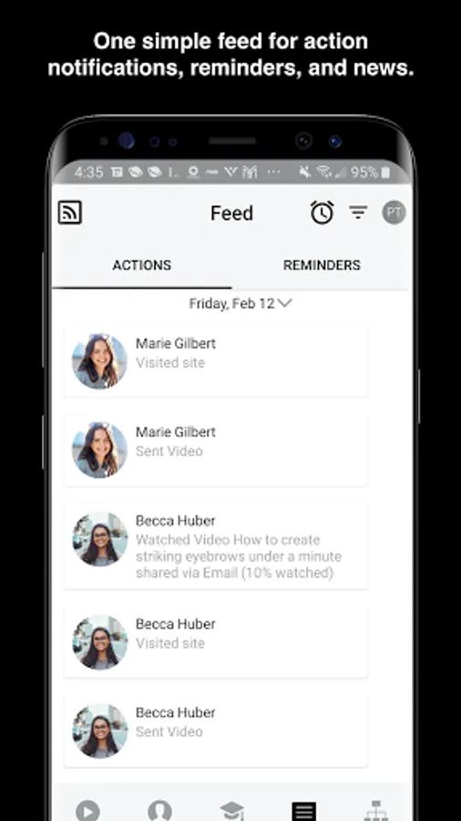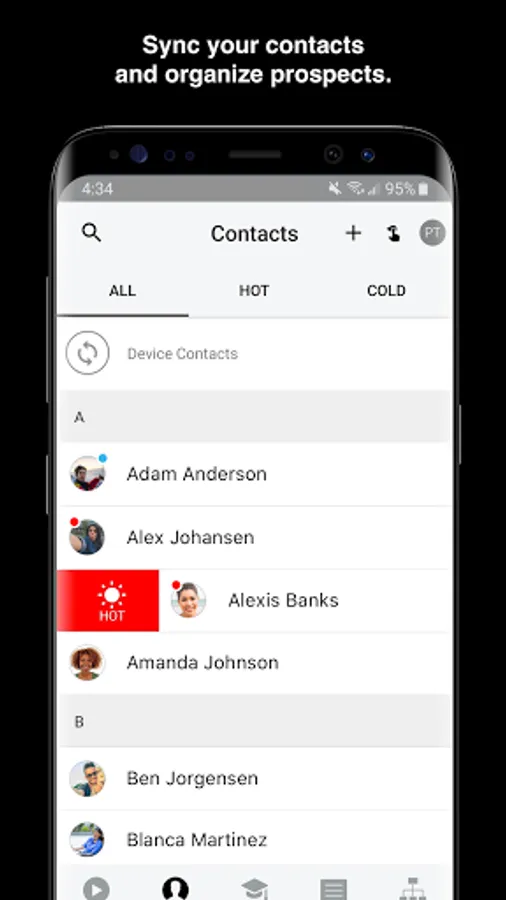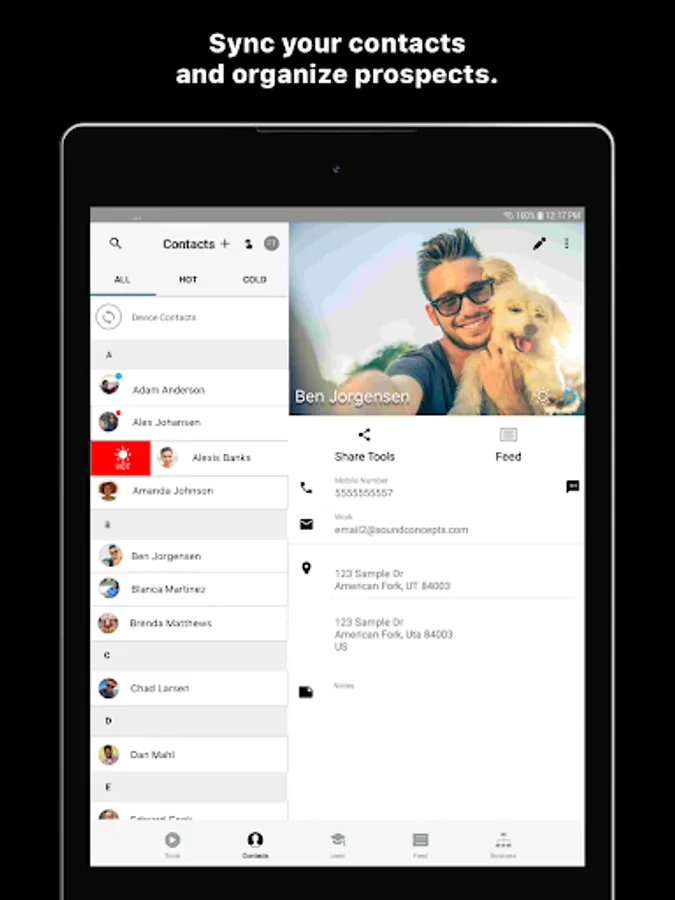 Contacts: Choose how to sync and manage your contacts. Swipe to sort them by interest level. You can make connections, add notes, or check out the Contact Feed to see the tools you’ve shared and contact actions.
