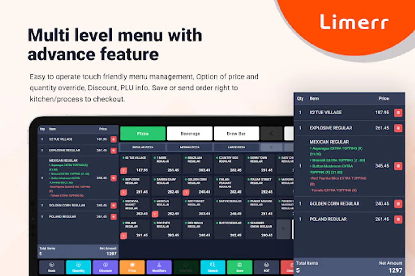 - Connect kitchen ticket printers or the Limerr Kitchen Display app.