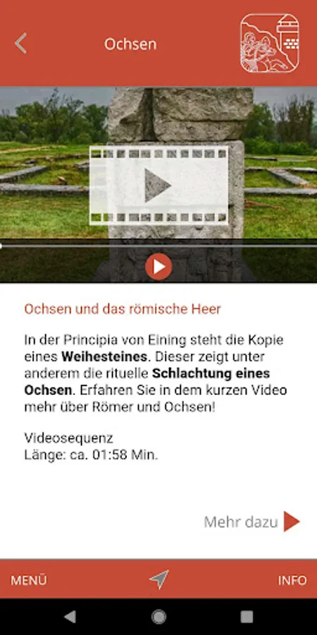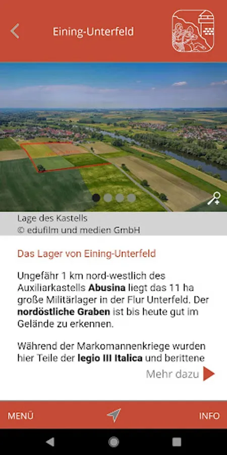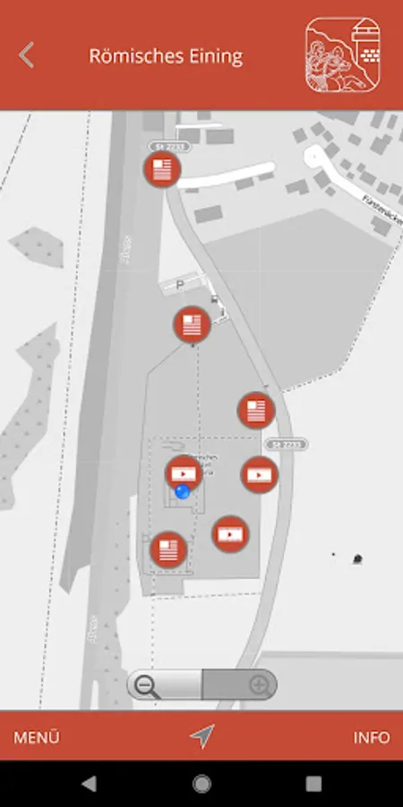 The zoomable OSM map data (© OpenStreetMap) provides easy access to the content. Both maps and content are available offline (internet connection is not mandatory). Clickable Points Of Interest on the maps start the content on request. 3D models, AR features, 360 views, video and audio sequences as well as text-/picture information are provided. An integrated GPS navigation with an alert guides you to the sites. An alternative list view shows you the available content.