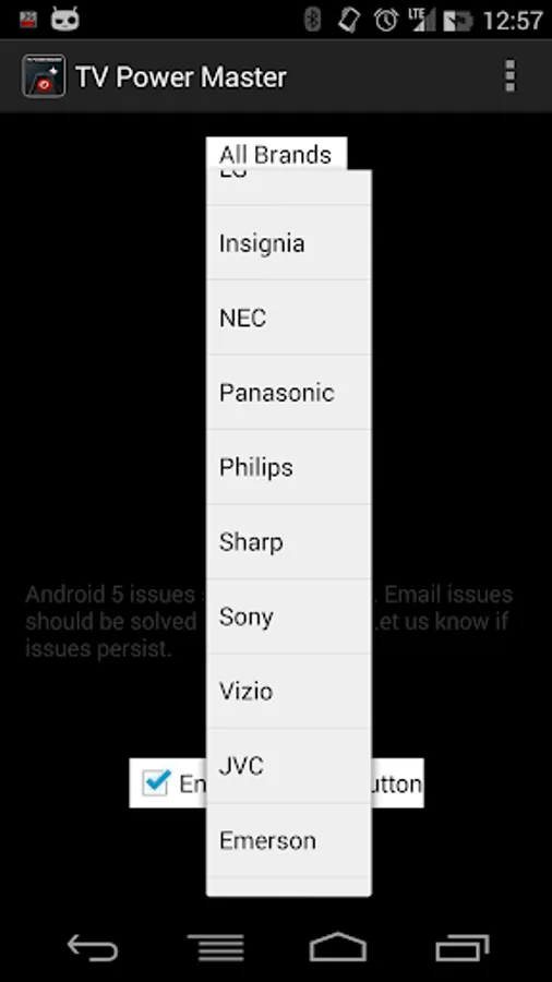 This app works by cycling the on/off codes for a bunch of major brands. This is the premium version of this app and does NOT have ads in it. The free, identical version can be found here: https://play.google.com/store/apps/details?id=com.limeysoft.tvoff