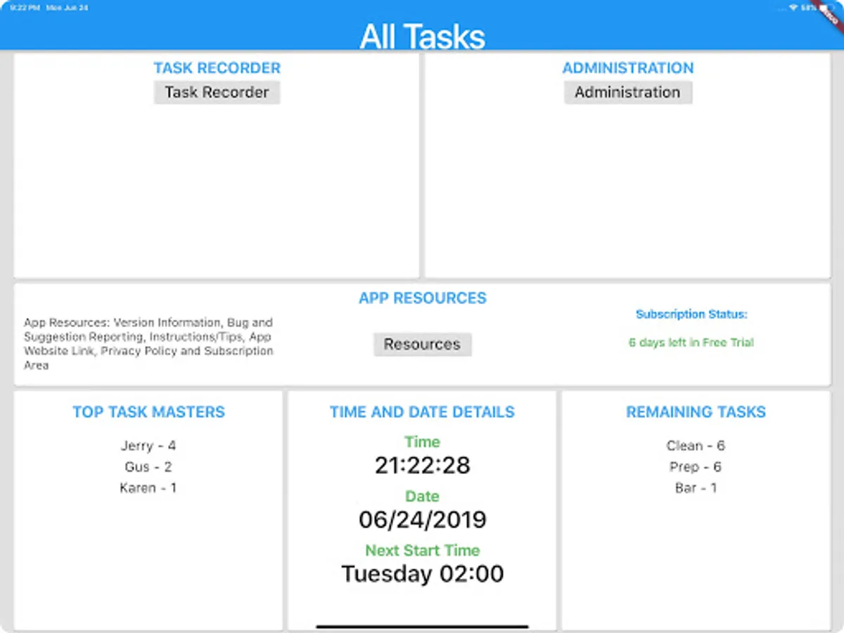 All Tasks is not a typical todo list. It is meant for Employers or Groups that need tasks completed on a regular basis. ie, clean bathrooms, prep food.