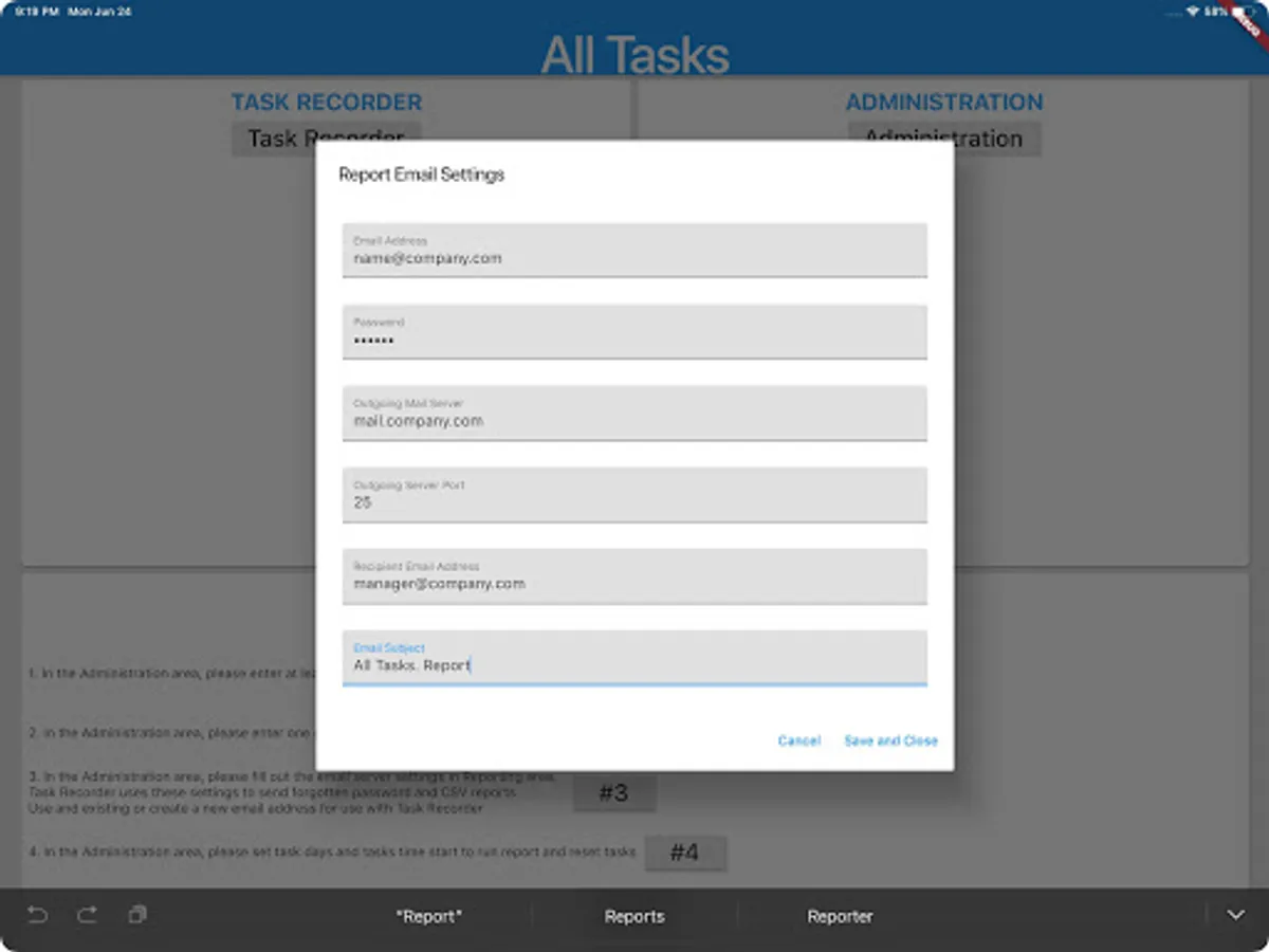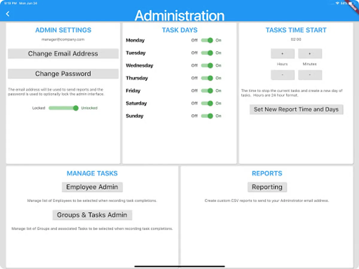 No more pen and paper, Excel sheets or spending time daily saving and storing paper reports. Reports are rolled over according to a determined schedule and sent as a CSV file to a specified email address for review on task completions by employee or tasks that were not completed.