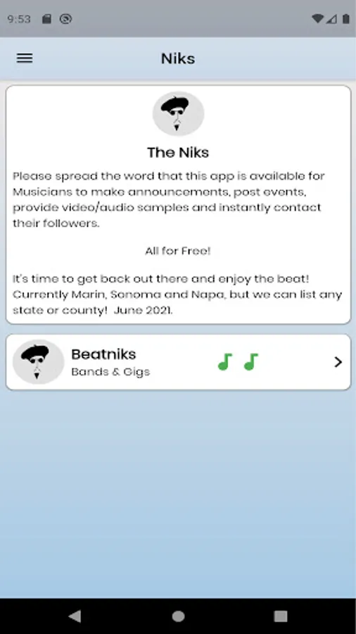 Niks provides high visibility for local bands and local home businesses. Currently Sonoma County has events listed, but if you are a band or a business that would like to list events and shows, we can help you get the word out. Niks is a free app that allows bands or home businesses to post upcoming events, updates and band/product samples from their details page.