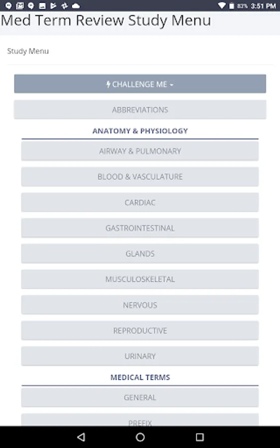 Medical Terminology Review is a focused study and review tool for any student or practitioner in allied health professions including EMS, RN, CNA, medical coding and transcription and more. Divided into intuitive sections based on body systems, users of this app will be able to learn the relevant terminology for healthy patients and disease states through more than 1000 study cards. Two multiple choice end tests measure your success.