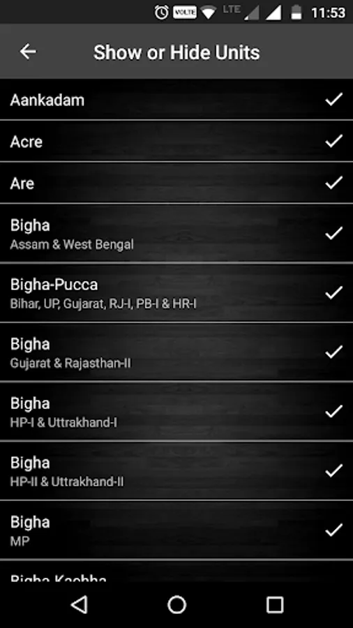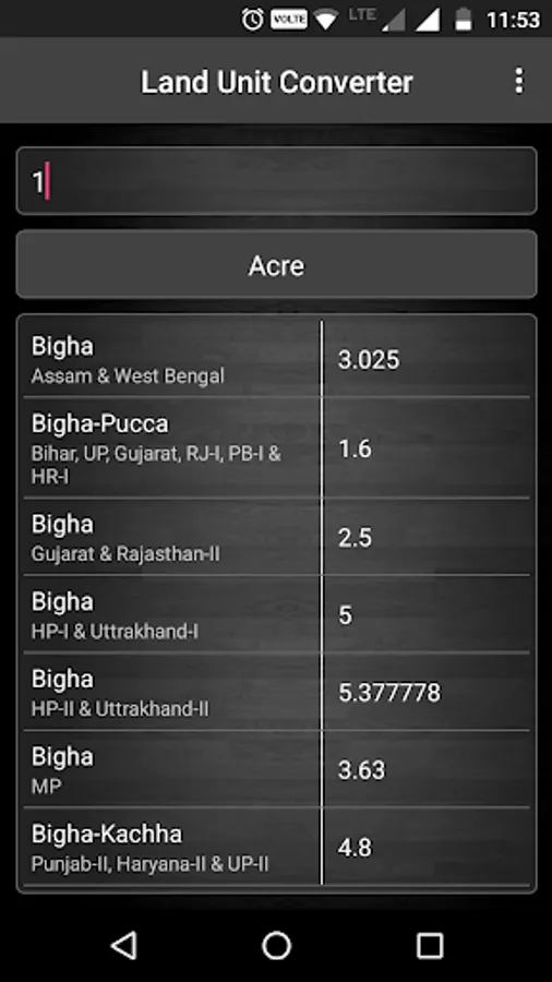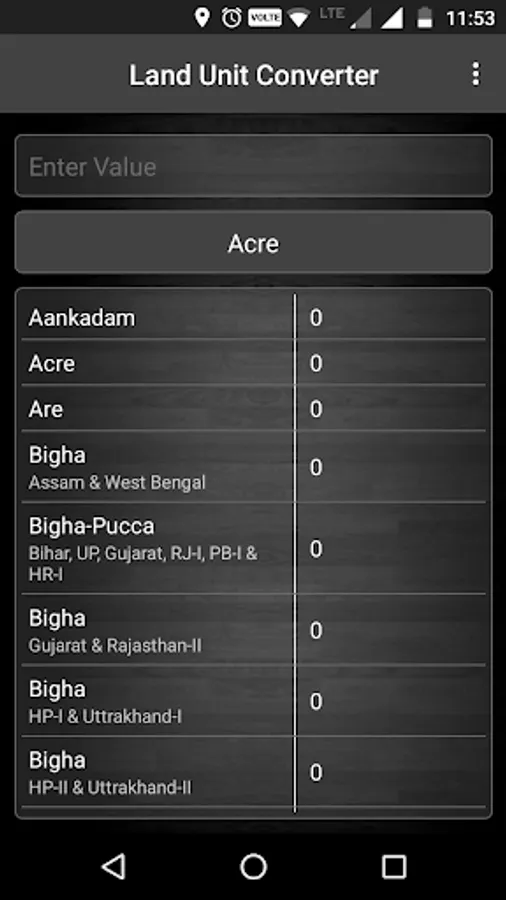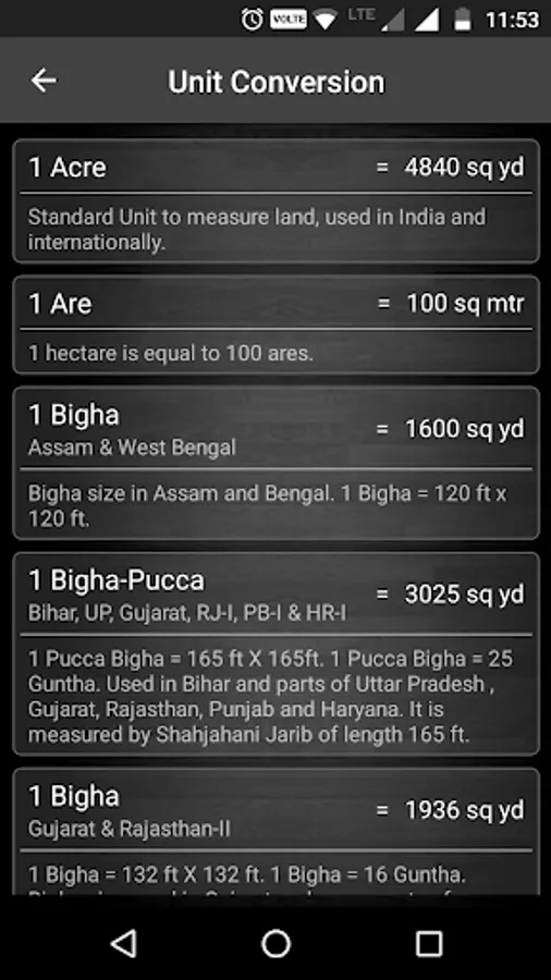"Indian Land Unit Converter" is helpful to convert all the basic units of Land and Area conversion in Indian States. In India Land Measurement units vary from state to state. Standard units such as Square Feet, Square Yards, Square Meters, Acres and Hectares. Local units such as Bigha, Biswa, Marla, Kanal, Ground, Cent, Ankanam, Guntha, Kattha, Shatak, Kantra, etc. Sizes of units like Bigha, Biswa and Kattha also vary from state to state.