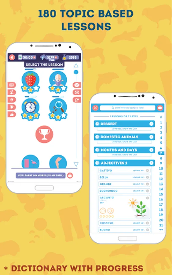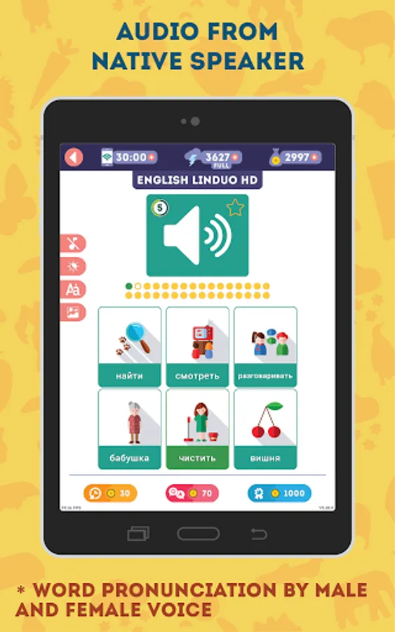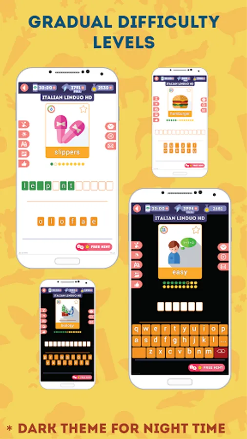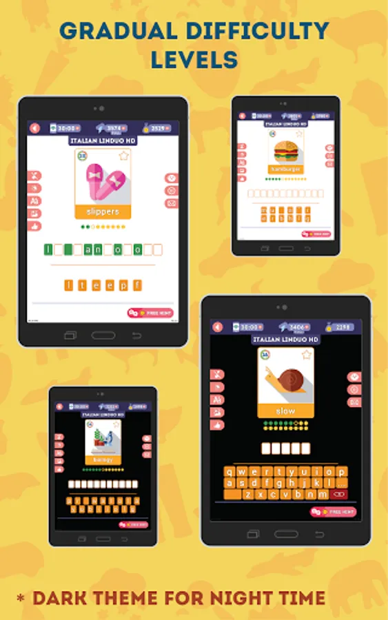 Dynamic lesson difficulty The app changes lesson difficulty gradually as you progress. To achieve this, it keeps stats for EVERY word! Example: in the spelling mode, initially you need to insert several missing letters in a word, then create a word having extra letters and finally, when you are ready, you will need to type the entire word with a virtual keyboard.