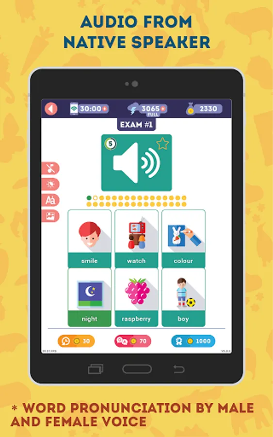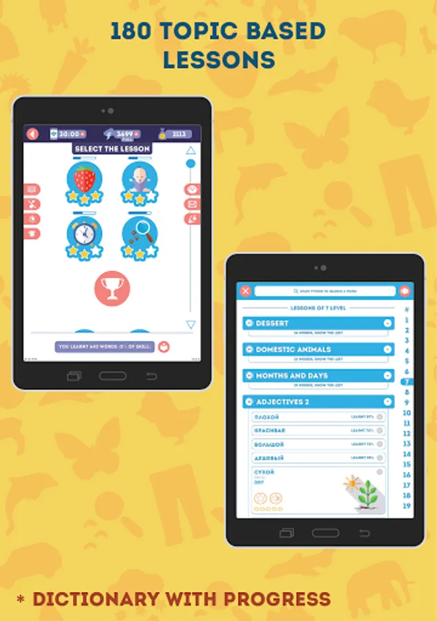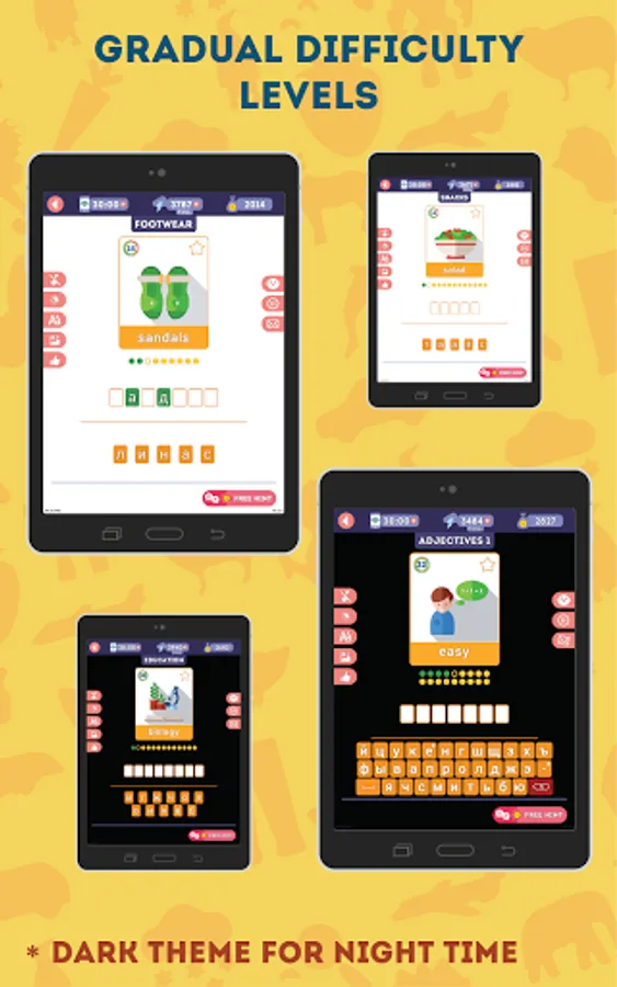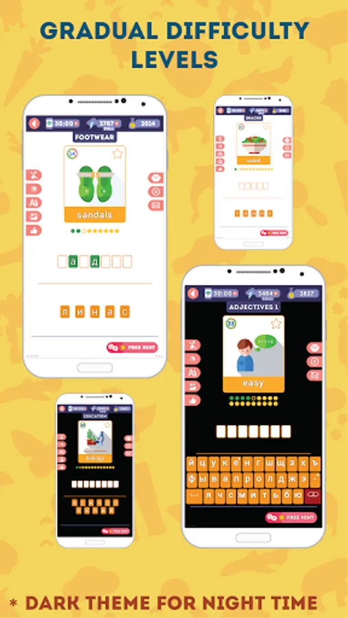 Dynamic lesson difficulty The app changes lesson difficulty gradually as you progress. To achieve this, it keeps stats for EVERY word! Example: in the spelling mode, initially you need to insert several missing letters in a word, then create a word having extra letters and finally, when you are ready, you will need to type the entire word on the keyboard.