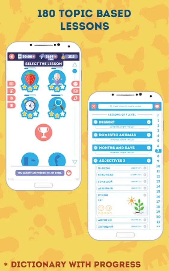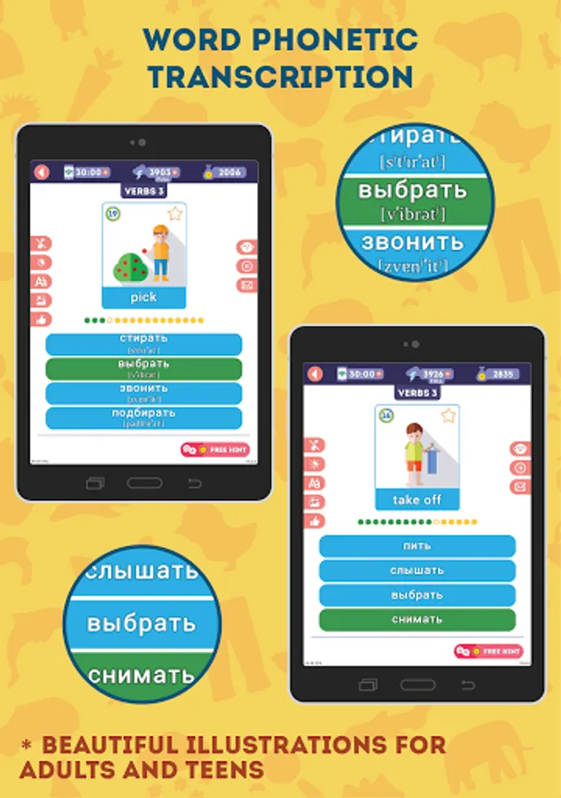 Do not need to know how to read If you cannot read yet, no problem! Each word has a transcription in your language! And for more experienced ones, in the settings, you can choose a phonetic (like in a dictionary) transcription.