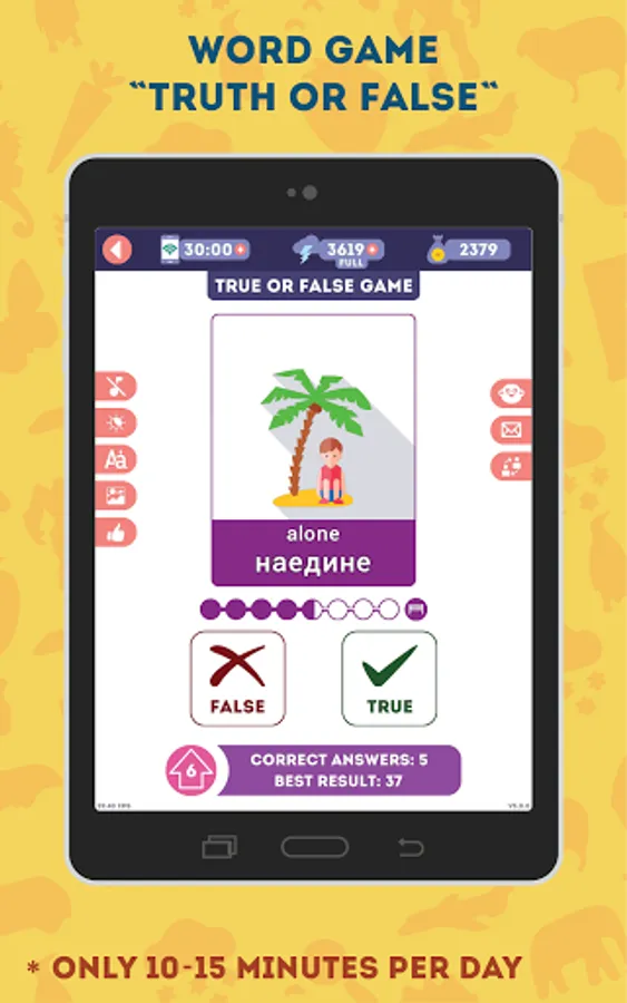 Review Past Material Many good apps do not pay enough attention to review past material! For this purpose we created the word game "True or False". It is very simple, but it's addictive and the most importantly, it helps to repeat past material and never to forget it!