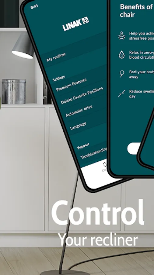 The free LINAK My Recliner™ App lets you control up to three adjustment options (back, leg and neck). You can also buy the premium features in the app to get additional features such as battery status.