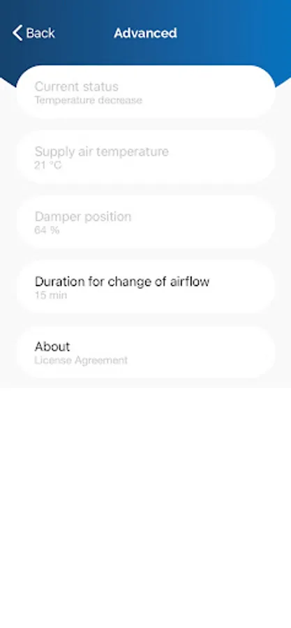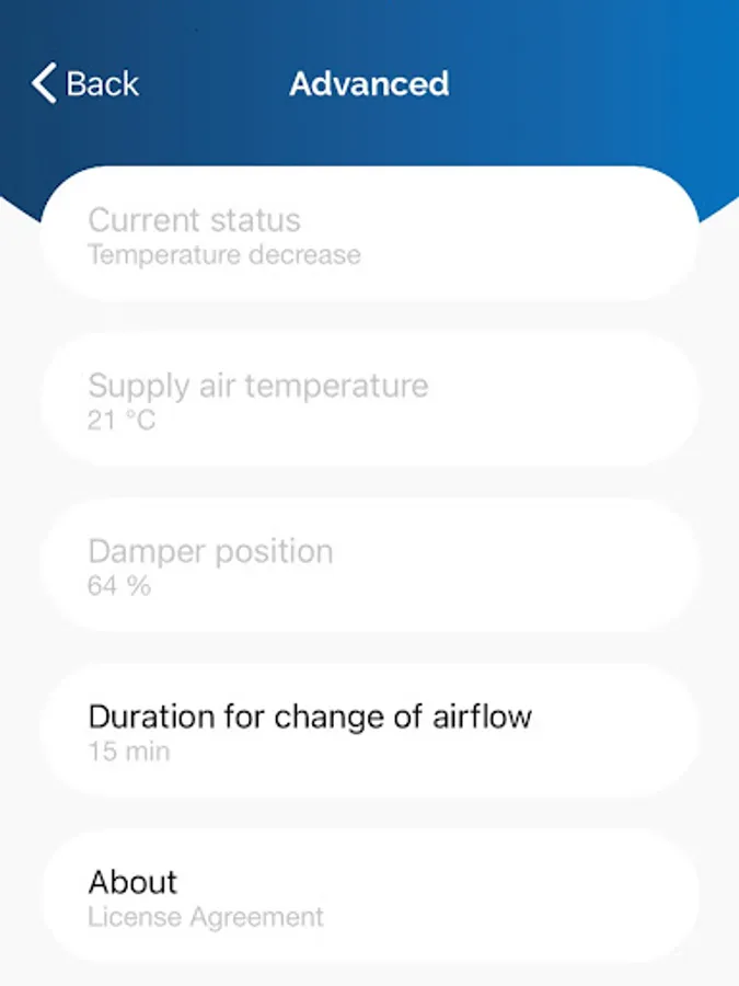 The app connects via Bluetooth to the product installed in ventilation ducts.
