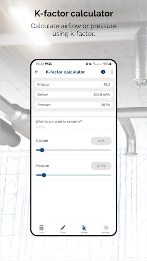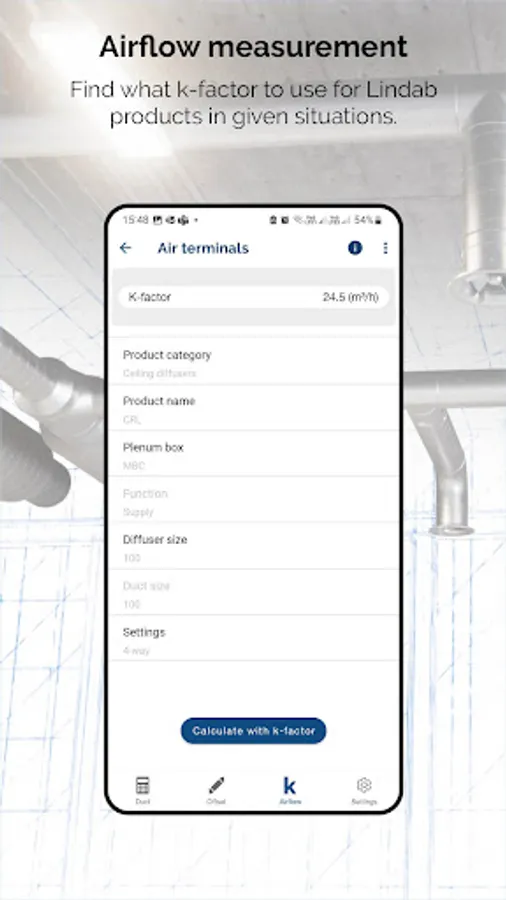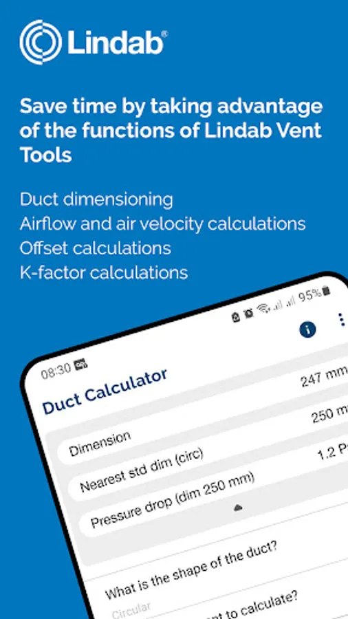 Lindab Vent Tools is a collection of practical calculation tools for ventilation systems in the HVAC industry. The app facilitates calculation of duct dimensioning, pressure drop, airflow and offset when installing Lindab’s products. The app also includes a k-factor calculator that can be used outside of Lindab’s product range.