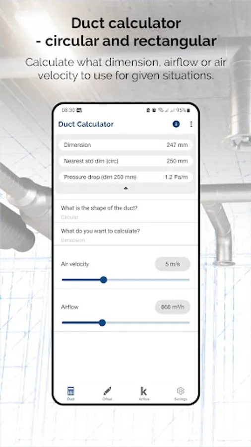 Calculates dimensions of circular and rectangular ducts by adding requirements of duct dimension, airflow and air velocity. Choose between two parameters to calculate the result of the third one. The requirements are defined by typing in each parameter or by moving the sliders for quick results.