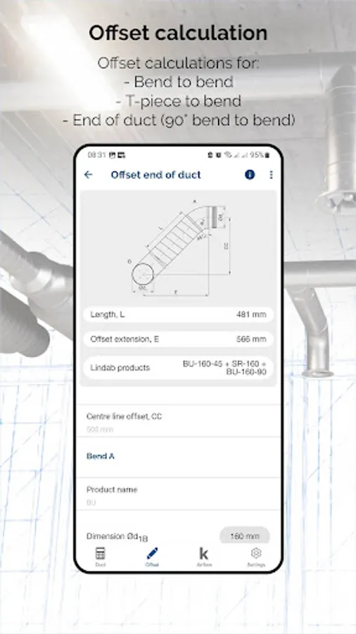 Calculates duct length, centre distance and construction dimensions for different offset situations; bend to bend, T-piece to bend and offset at the end of the duct (90° bend to bend).