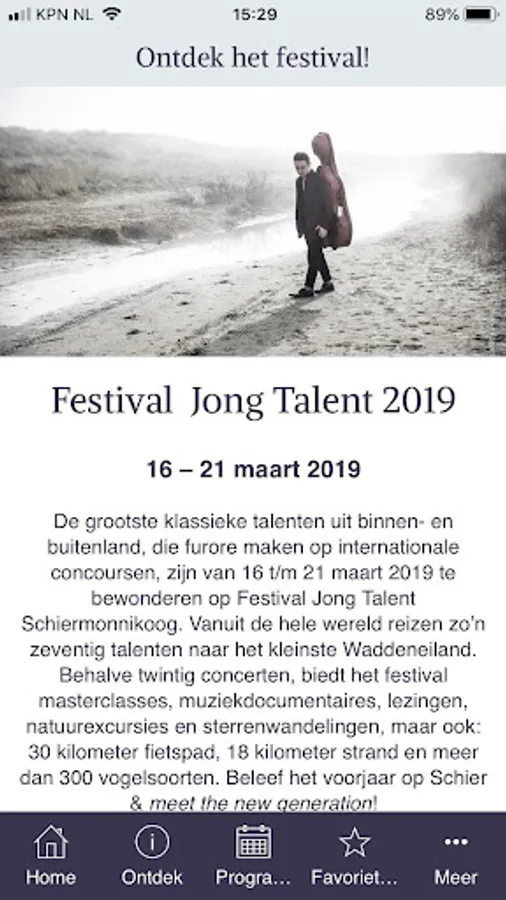 Twice a year, Schiermonnikoog changes into a place where music, nature and island experience come together, during the Schiermonnikoog Festival in October and the Young Talent Festival in March. The intimacy of chamber music and the unique experience of nature on the island reinforce each other and give the festivals their special character. In this app you will find the program, the musicians, the locations and much more.
