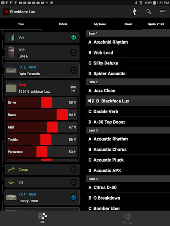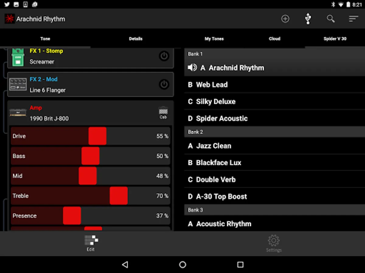 Connect to a Spider V via a USB OTG cable to browse, download, edit and save your guitar tones.
