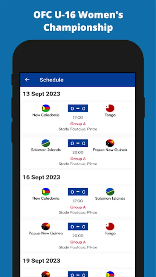 This app contains complete schedule of 2023 OFC U-16 Women’s Championship