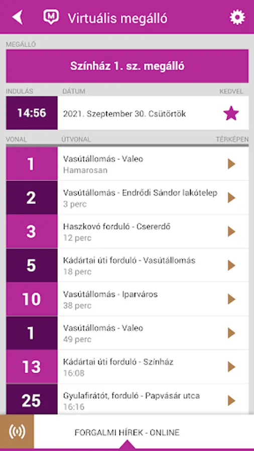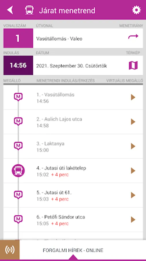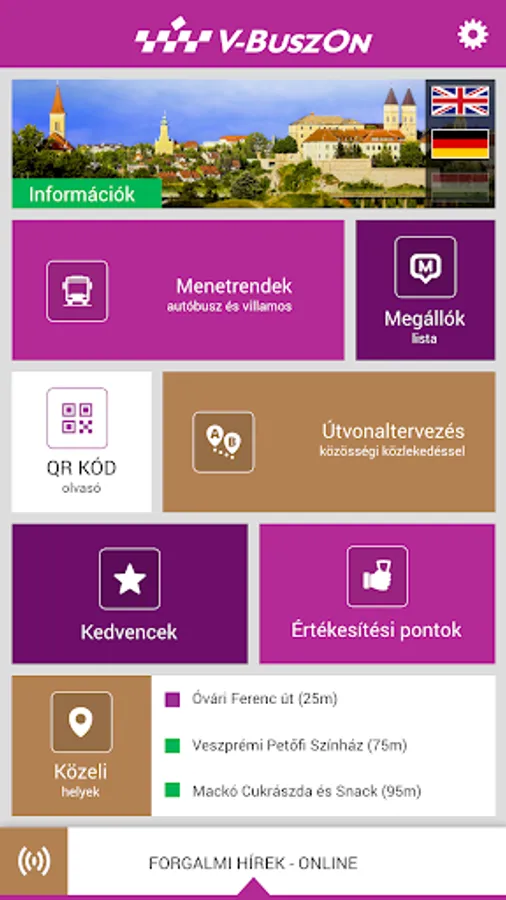 The program provided by V-BUSZ Kft., Operating on the basis of an official database, always works up-to-date with the latest local timetable data from Veszprém. The application is able to give an accurate picture of the current position of active flights, as well as information about their arrival at stops - including any data that may deviate from the schedule.