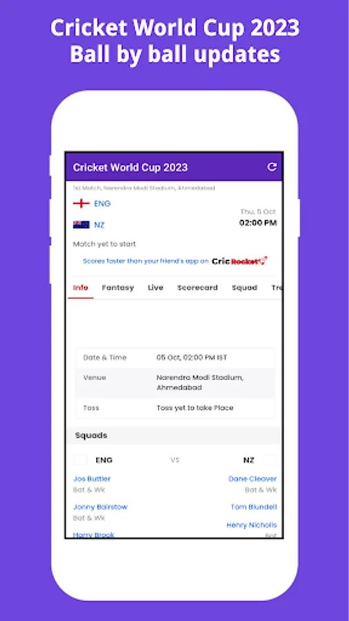 Whether you're a passionate cricket aficionado or a casual fan, this app will enhance your World Cup experience, keeping you connected with the sport you love. Download the Cricket World Cup 2023 Companion app today and be a part of the excitement as cricketing history unfolds before your eyes. Join the global community of cricket enthusiasts and celebrate the spirit of the game in style.