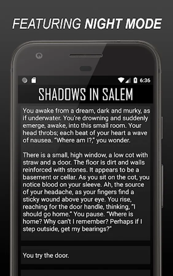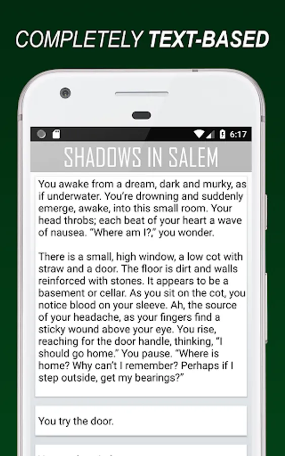 Shadows in Salem is reminiscent of the old style Choose Your Own Adventure books (CYOA). In the age of modern technology, we strive to realize the core of what matters most- storytelling. As a completely text-based game, you are left alone to visualize the adventure, and YOU are the main character.