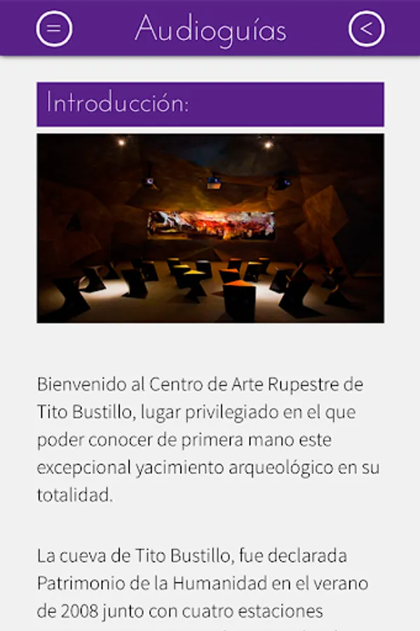 Enjoy the Rock Art Center of Tito Bustillo through this application. Besides many details to get the most out of your visit, the app you can take advantage of the audio guide service and make a preliminary "virtual" tour of the explanations or enjoy the day of your visit. The speech is available in Castilian, English, French and German.