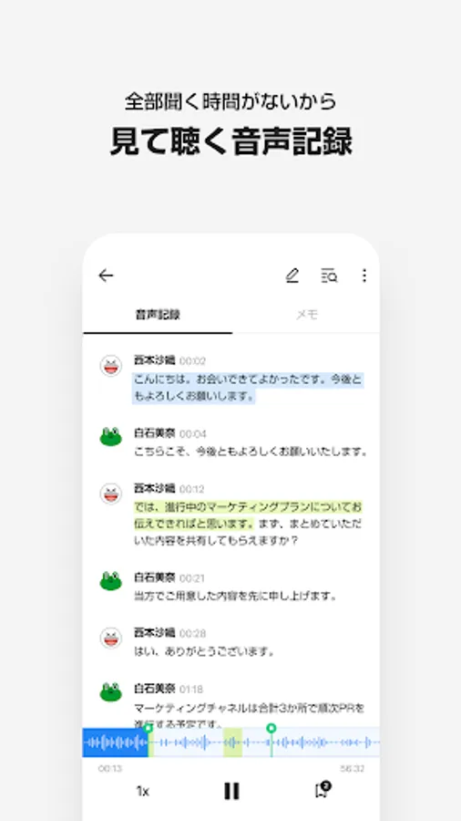 Have you ever had the problem of not knowing who spoke when you were taking minutes while listening to the recording of a meeting? In CLOVA Note, AI distinguishes the voice of the speaker and displays the conversation separately for each speaker, such as "Participant 1" and "Participant 2". Of course, you can also edit the display of "Participant 1" to the name of the actual participant, such as "Mr. Tanaka".
