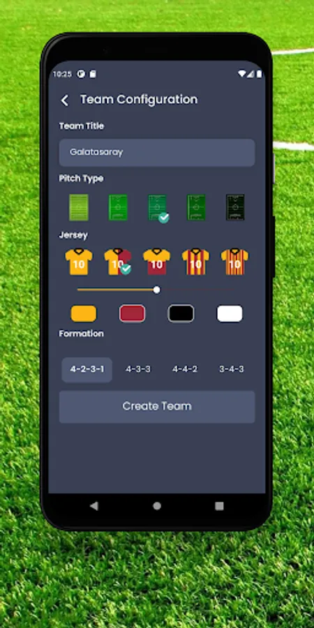 Type your team's name, set the colors, select a jersey, maybe different pitch color for your team, visualize the formation and you are ready.