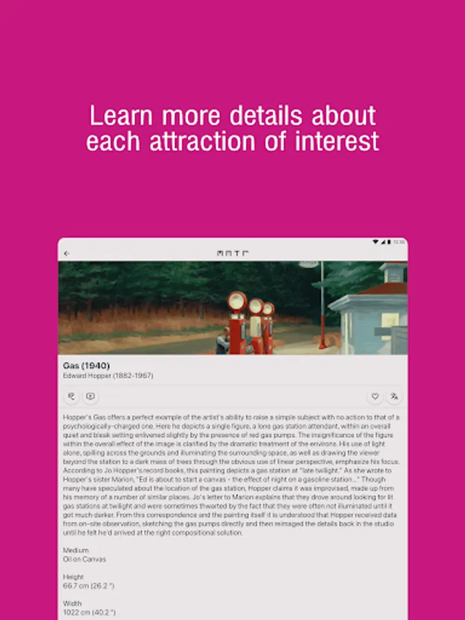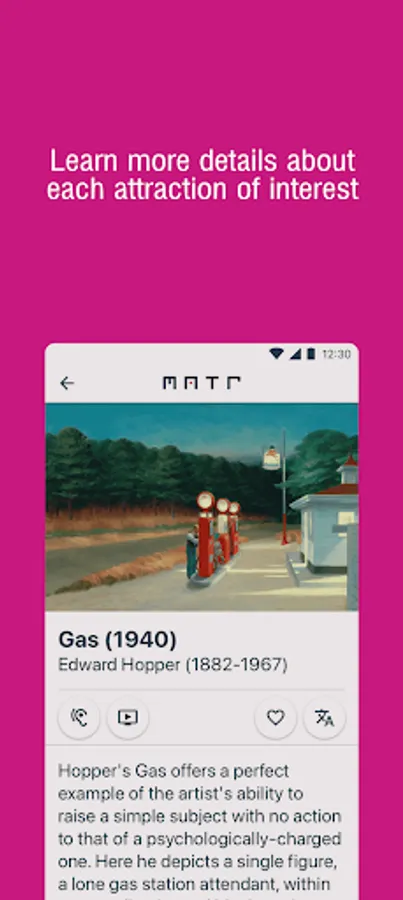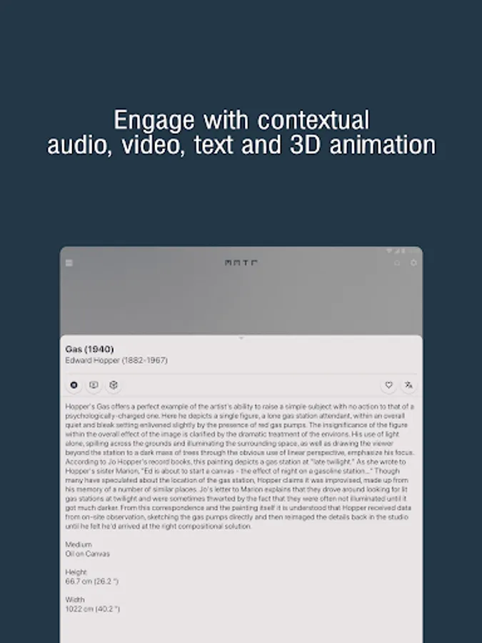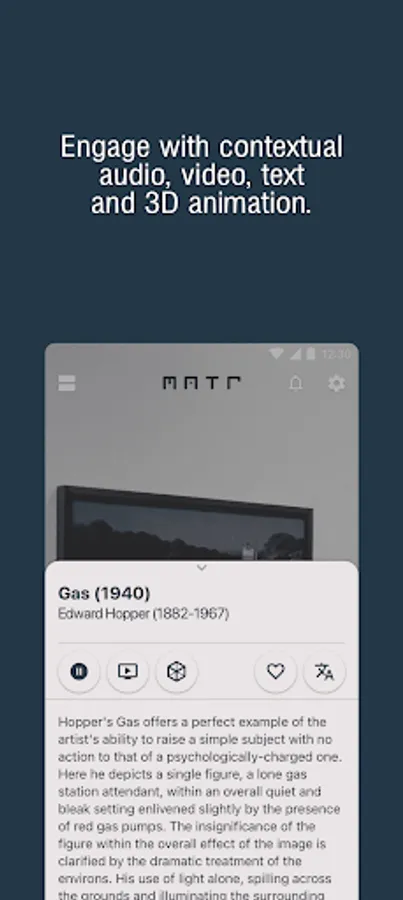 MATR also fully supports audio tours. Now, rather than use venue-provided devices, invasive QR codes or outdated equipment, just use your device to explore and listen to the tour your way. If translated in advance, MATR will also deliver this content in the language of your choice.