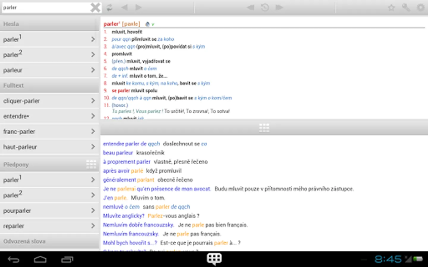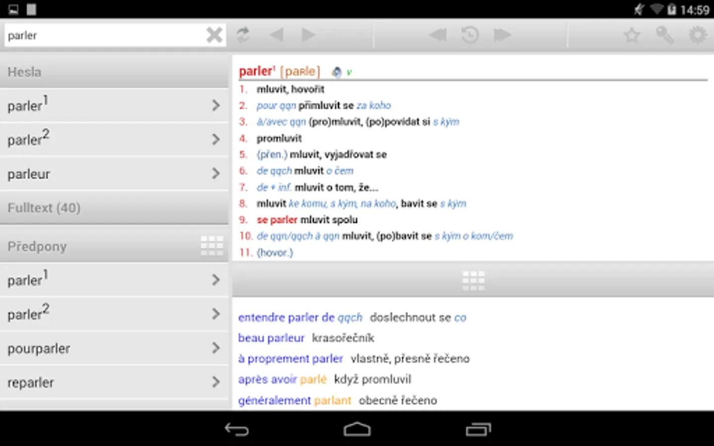 The dictionary contains over 102 000 carefully selected entries and 155 000 word meanings in both directions. Entries and meanings included in this dictionary cover virtually every area of current language, both general and technical. They were carefully selected based on a corpus of contemporary French and Czech and the Internet. There are over 155 000 useful phrases, collocations and example sentences illustrating virtually every entry and a total of 249 000 translations.