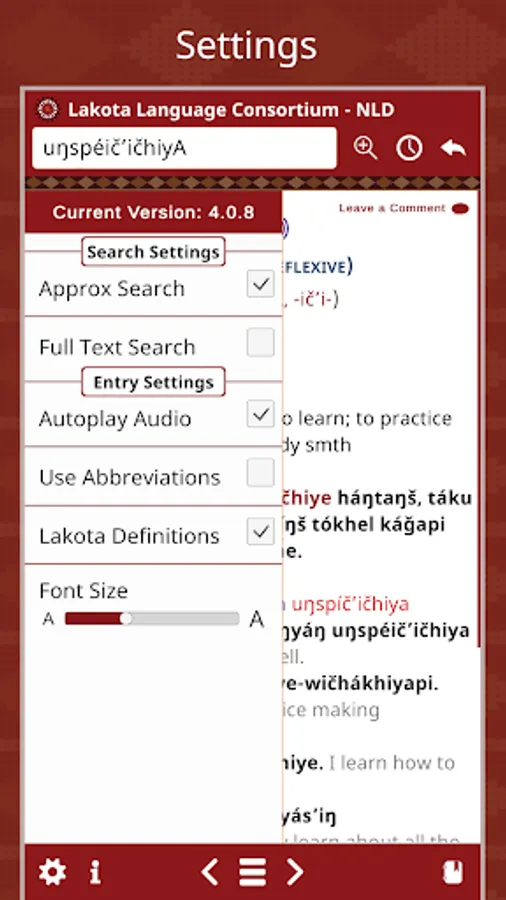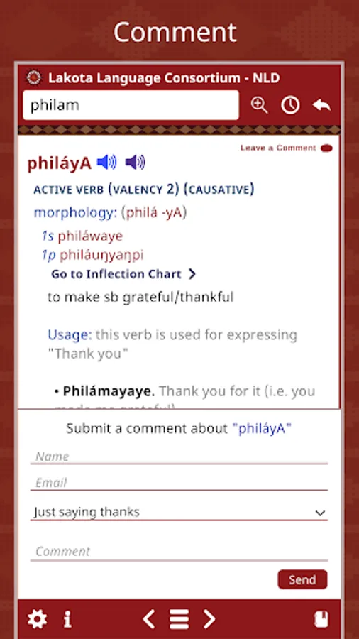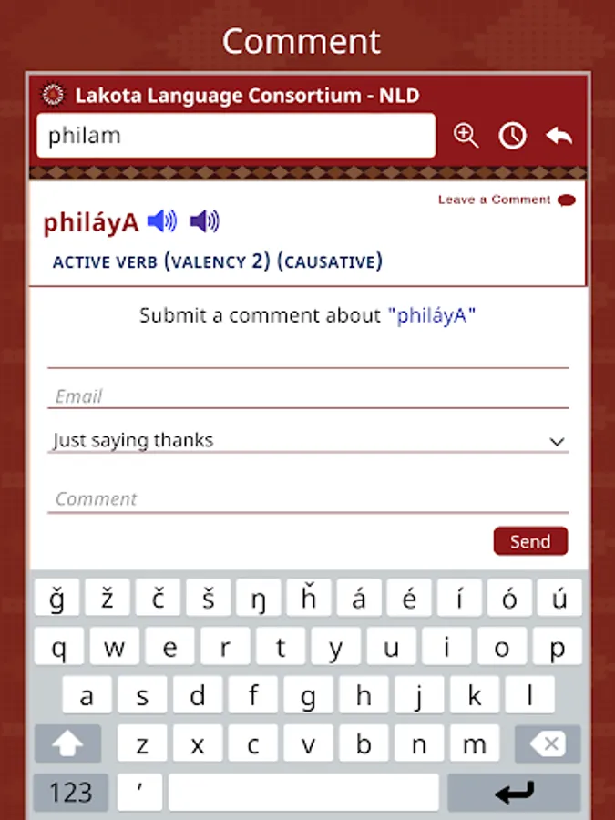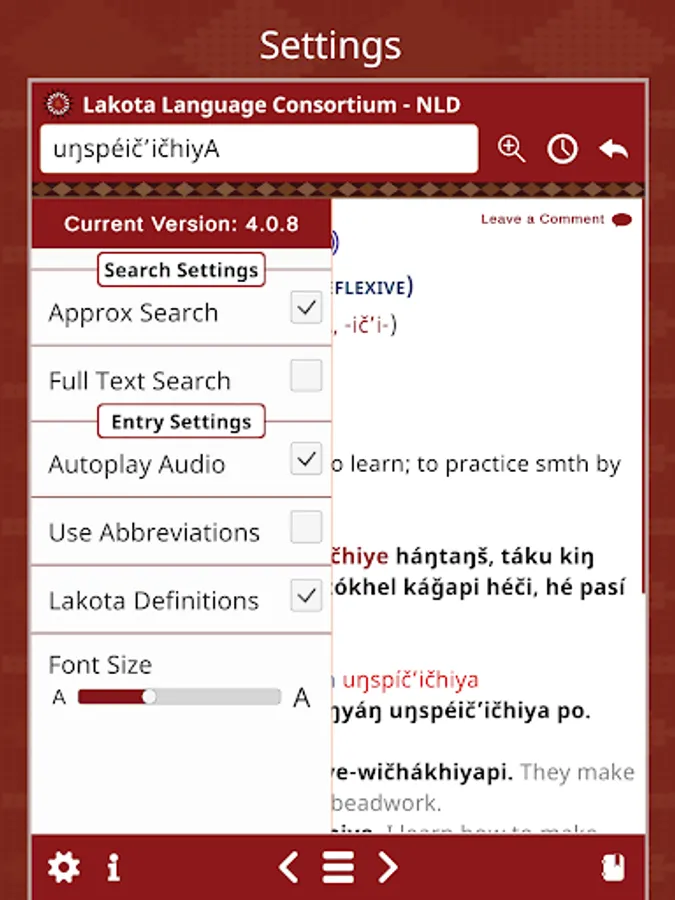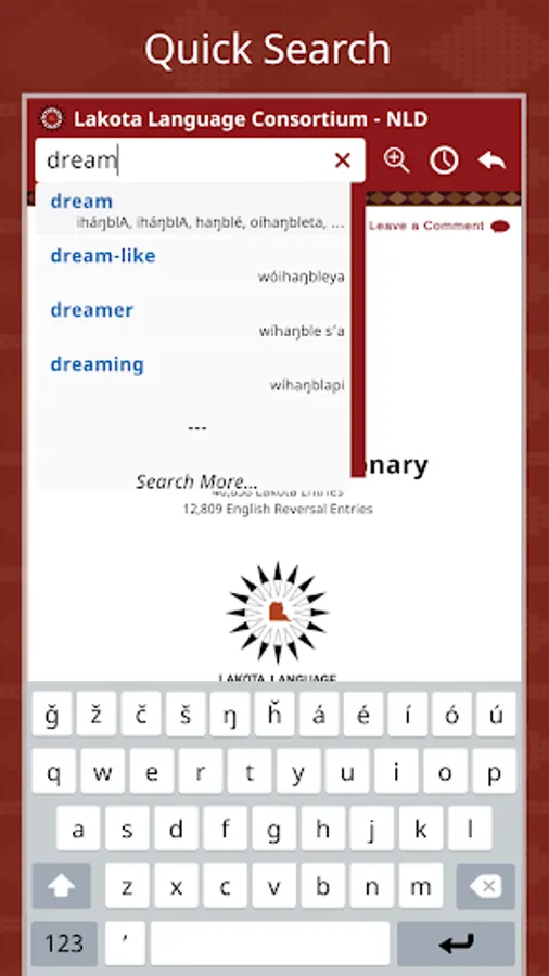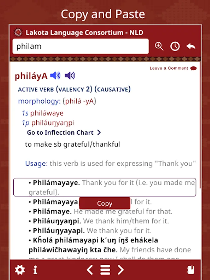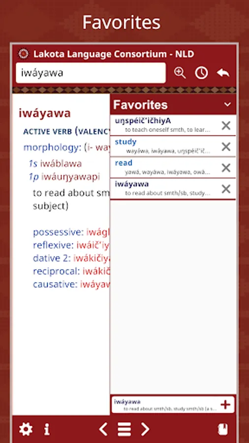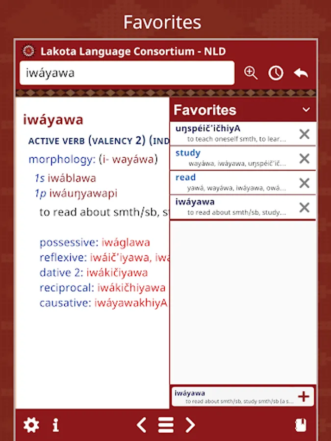 "The lemmatizer is one of the biggest advantages of the app when compared to the printed version of the NLD. Lakota is a highly agglutinating language. Affixes are added to words all the time, so unless you know the stem of the word with affixes, you won’t be able to find it in the dictionary. The app does that for you. If you type in e.g. waŋwíčhablake the app will show you the entry waŋyáŋkA."